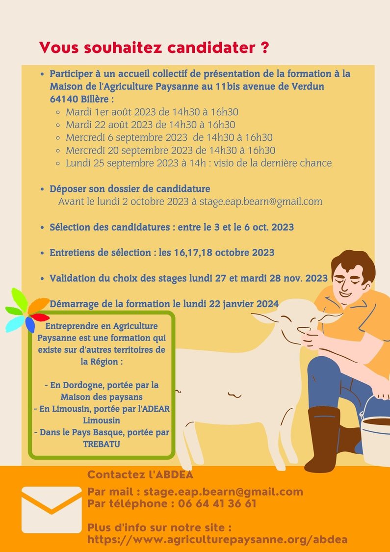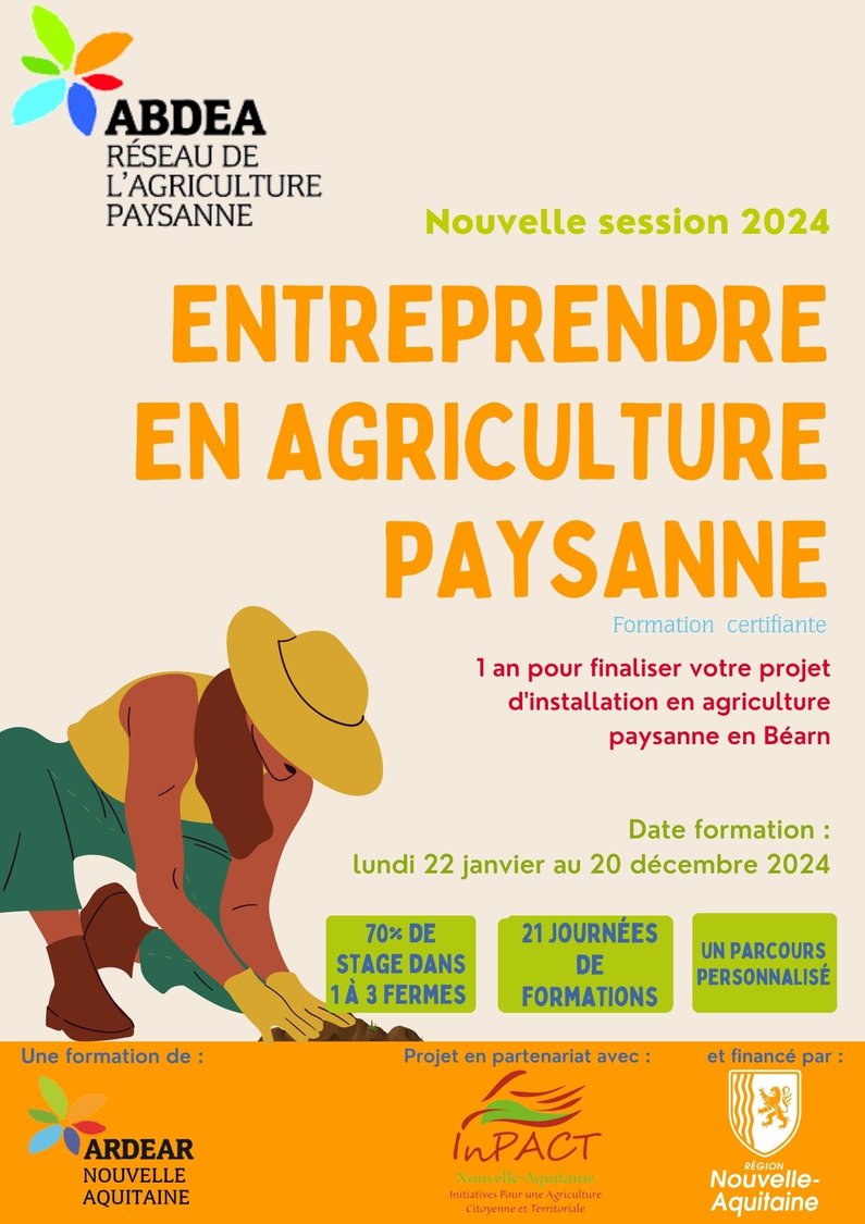 Entreprendre en Agriculture Paysanne est une formation majoritairement pratique (70% de temps en entreprise et 30% en centre), qui s’adresse aux personnes voulant s’installer avec un projet d’Agriculture Paysanne. Elle est financée par la Région Nouvelle-Aquitaine et donne droit à une indemnité pour les stagiaires en fonction de leur situation personnelle. Elle est proposée en Limousin, Dordogne, Béarn et Pays basque.