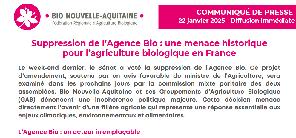 Le week-end dernier, le Sénat a voté la suppression de l’Agence Bio. Ce projet d’amendement, soutenu par un avis favorable du ministre de l’Agriculture, sera examiné dans les prochains jours par la commission mixte paritaire des deux assemblées. Le Réseau InPACT Nouvelle Aquitaine est contre, et Bio Nouvelle-Aquitaine et ses Groupements d’Agriculture Biologique (GAB), principaux concernés, dénoncent une incohérence politique majeure. Cette décision menace directement l’avenir d’une filière agricole qui représente une réponse essentielle aux enjeux climatiques, environnementaux et alimentaires.
